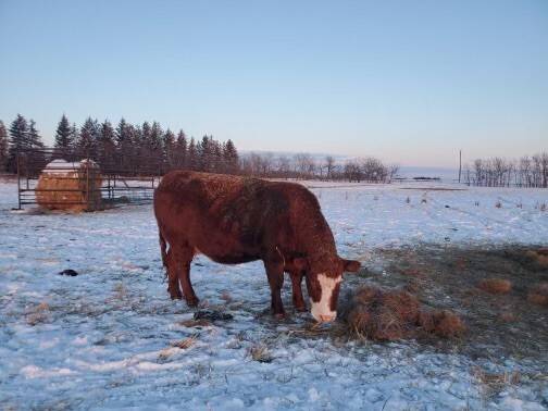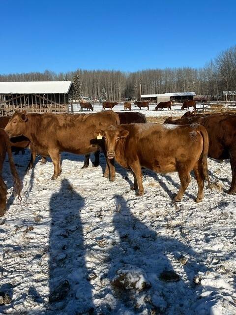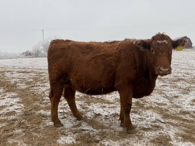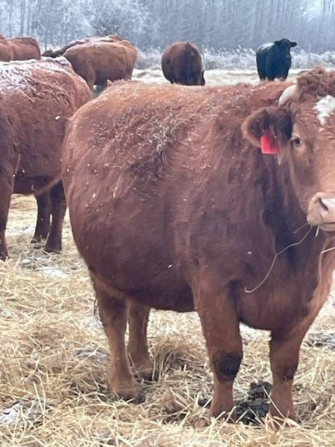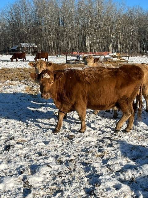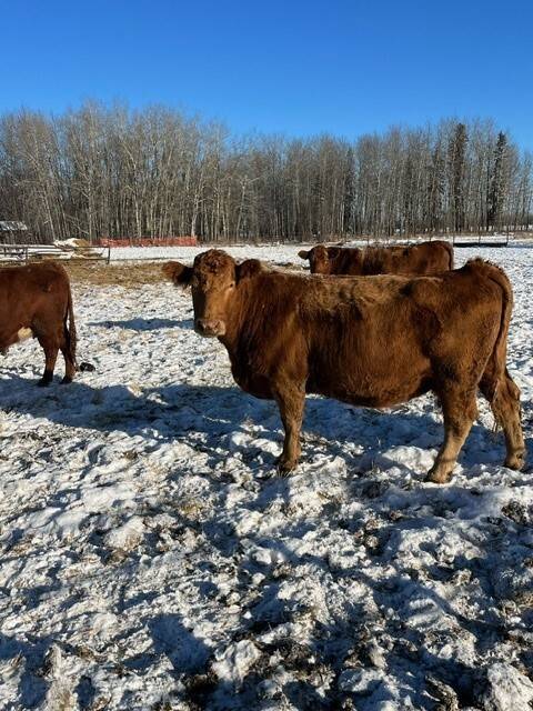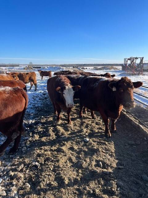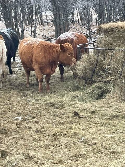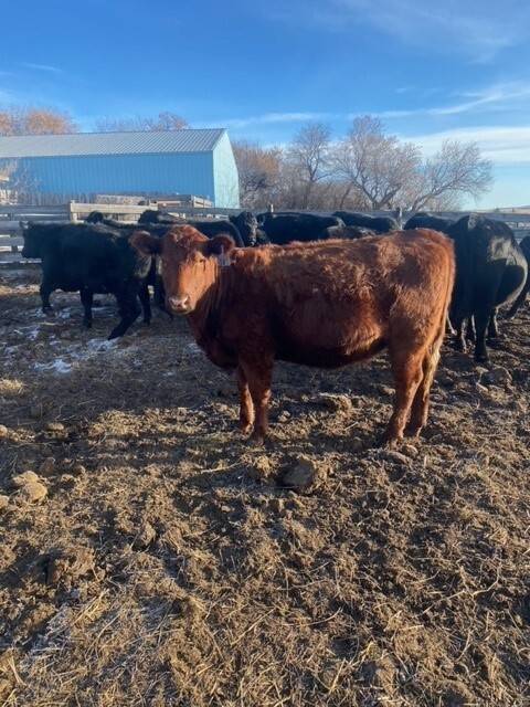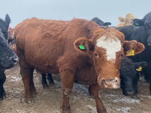 Herd reduction of 60 red and tan cows bred back Saler and red Angus for March 1st calving.