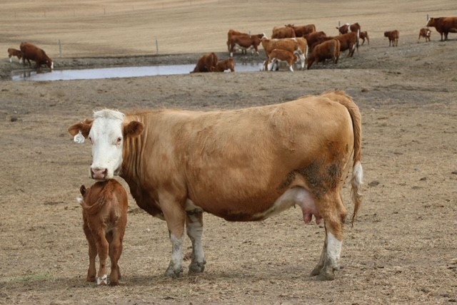 80 Angus cross cows with calves at foot. Calves are 2-6 weeks old. Cows are mainly reds and blacks with a few tan cows in the group and are a set of middle-aged cows.
