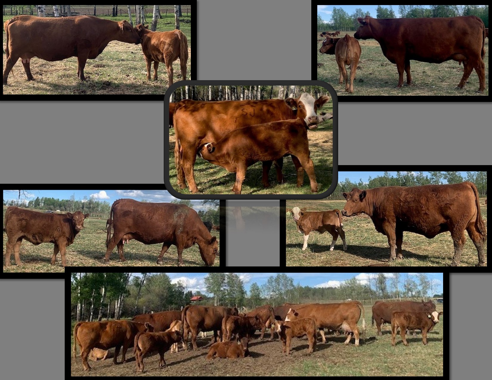 Red angus and Simmental cows with mostly February calves at side.