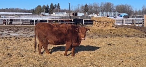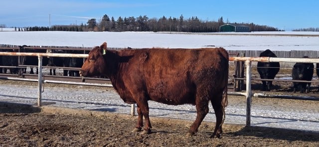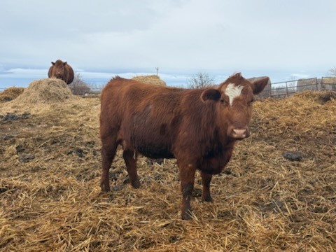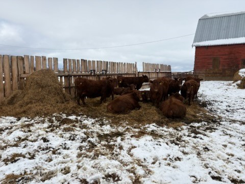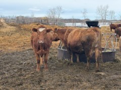 Exposed to Red Simmental bulls July 25th for May 1st calving.